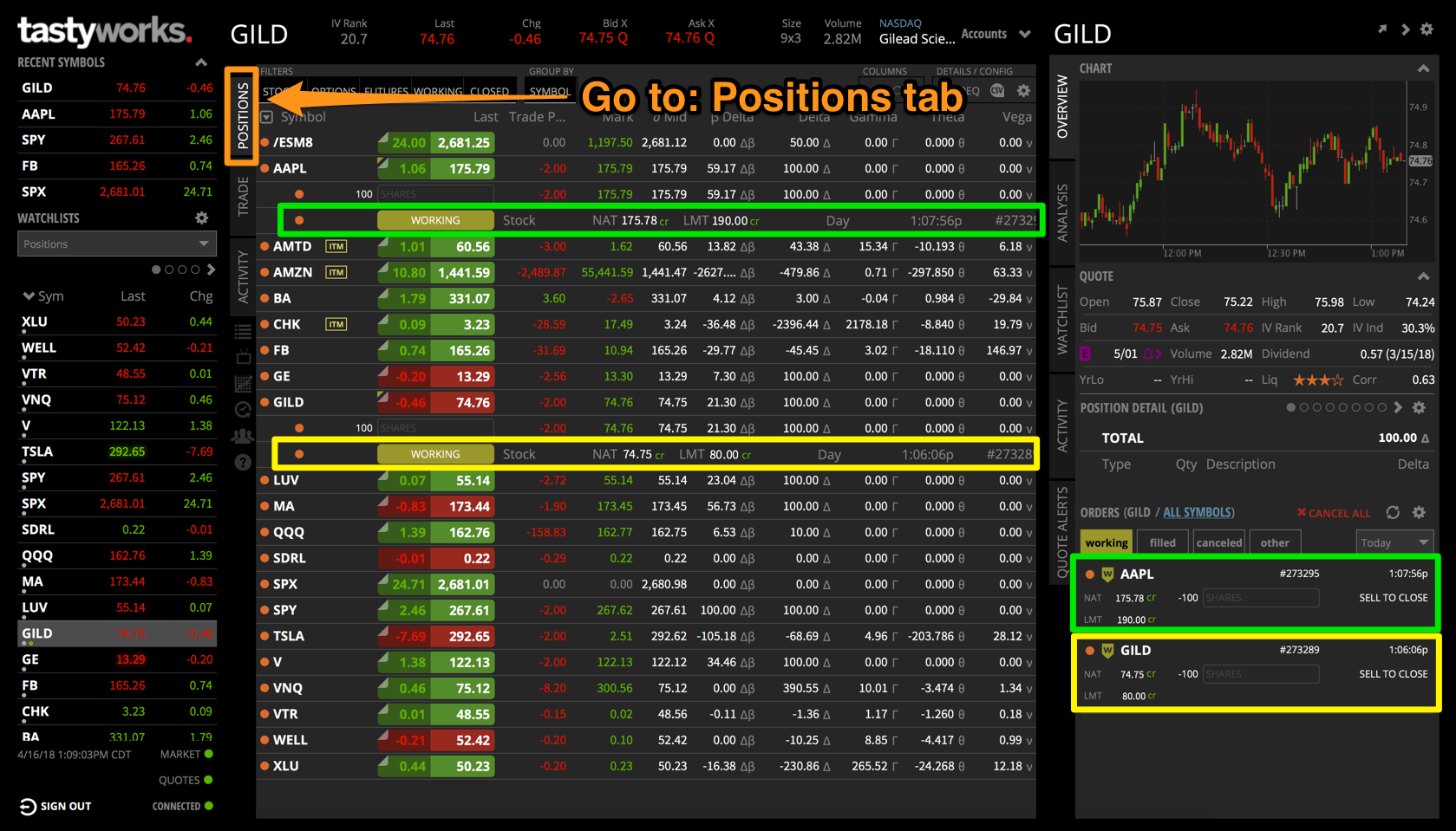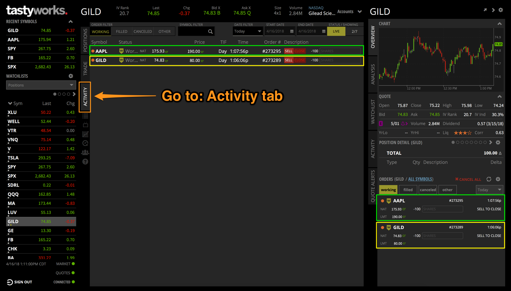 1. Janela de ordens: localizada na parte inferior da guia Visão geral no menu da barra lateral direita ou;